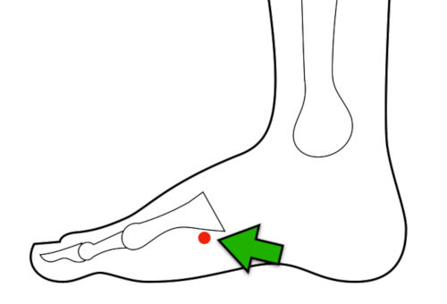SP-4 is located in the depression distal and inferior to the base of the first metatarsal. It's about 1 cun away from SP-3; don't go all the way to the cuneiform bone.